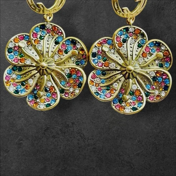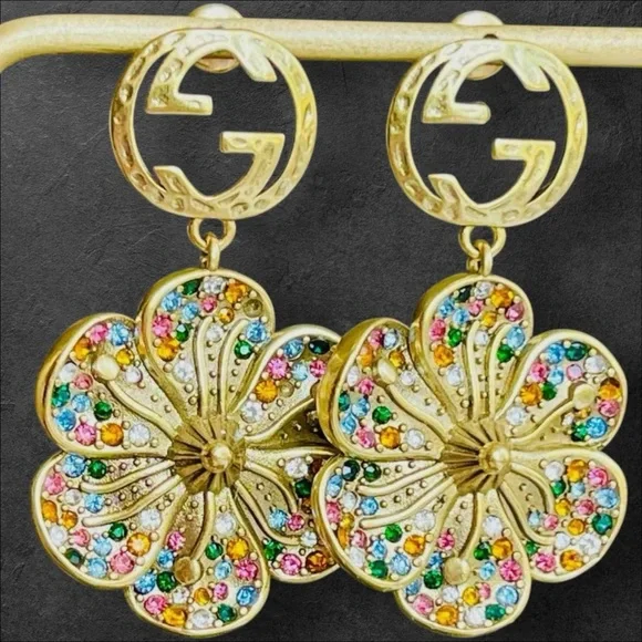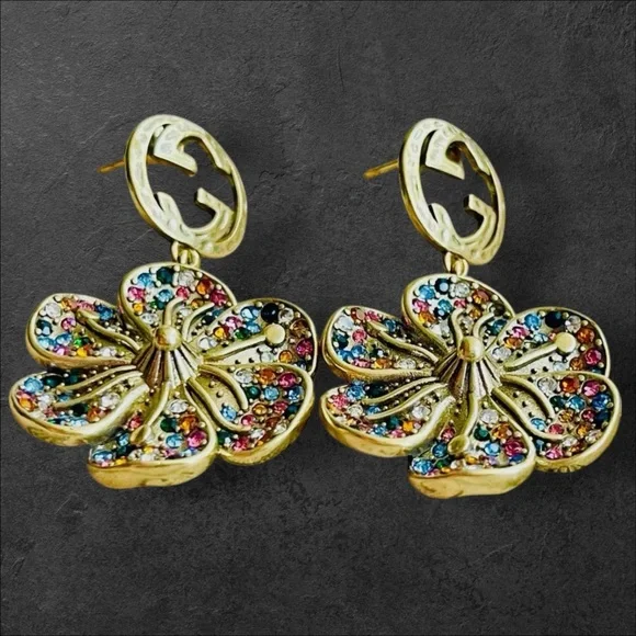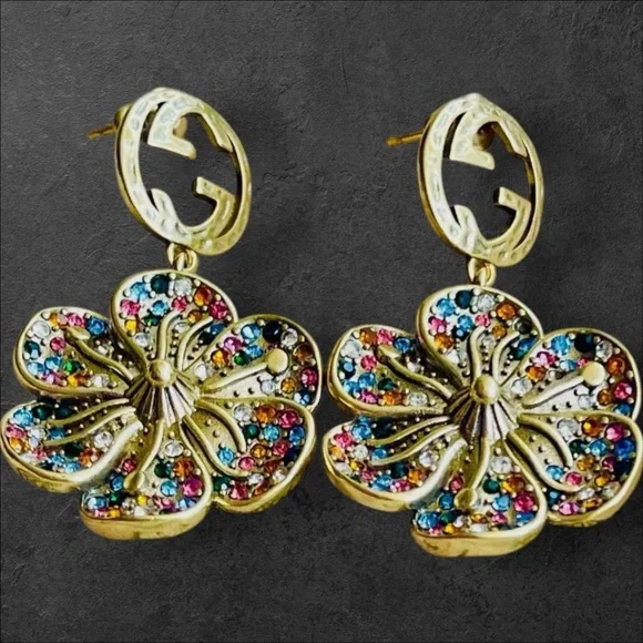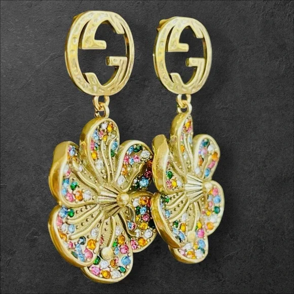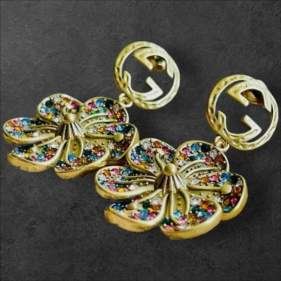 GUCCI Logo Multicolor Crystal Floral EarringsExcellent Condition 100% Authentic Gold MetalMulticolor CrystalsFor pierced earsFull Inclusion: Includes Gucci Dust-bag and Gucci BoxElegant gold earrings featuring a vibrant floral design with multicolor accents. Stamped on back.Approx Measurements: 2” length x 1” widthFeel free to make an offer if you like the item but not the price- all reasonable offers considered.Please review the photos carefully-they are part of the description. Items are preowned and sold "as is" unless description indicates otherwise. Preowned items are generally not in perfect condition so please manage expectations and do not purchase if you are picky or expect perfection. Vintage items usually have wear consistent with age.Please ask questions prior to purchasing or making an offer, as all sales are final.